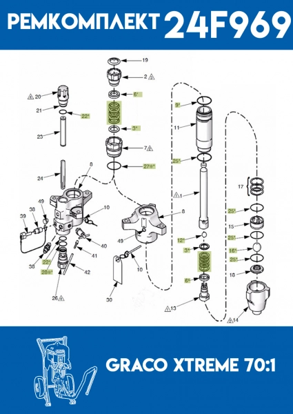 На схеме позиции входящие в ремкомплект № 3, 4, 9, 12, 19, 22, 25, 27, 29, 59 для насоса GRACO NXT 70:1, 180 СС AG- 25D235; AG- 24F969